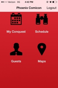 The main screen gives you four options as well as the ability of log in/logout in the upper right hand portion of the screen. Make sure to sign up via Phoenix Comicon