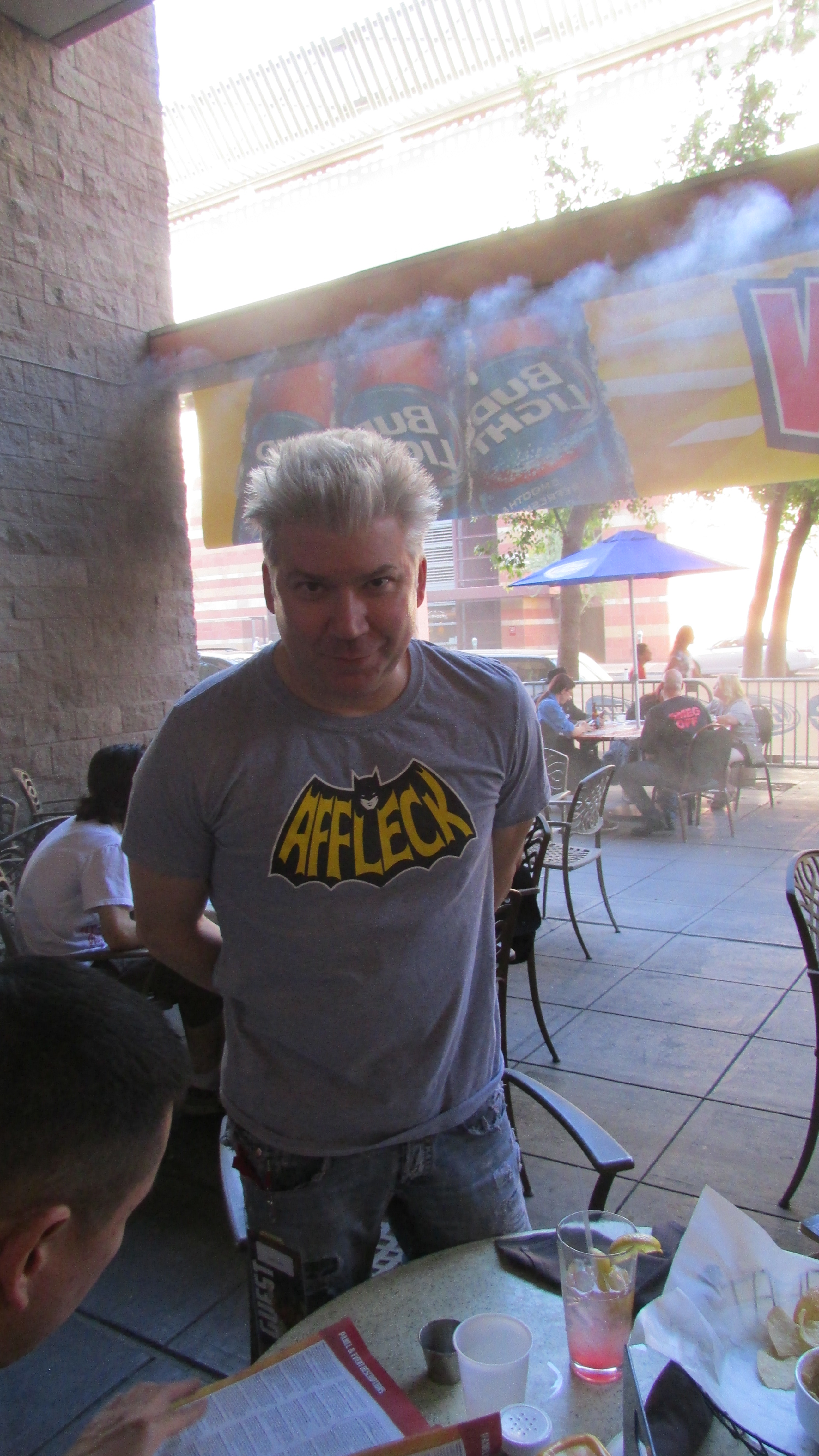The day was a rough start, I waited in line for an hour for media badge pick up, the panelist/professional line went way faster. After securing my badge I went back up stairs to the convention food court, I had a huge dilemma deciding between pizza or Chinese food when the fire alarm went off. If you went to Phoenix Comicon (Phxcc) last year, you know the alarm went off at the end of the convention on Sunday. The entire building had to be evacuated and so I decided to walk over to the Hyatt and grab a bite at the Network Bar & Grille. Ended up at the table next to geek favorite Chris Gore.