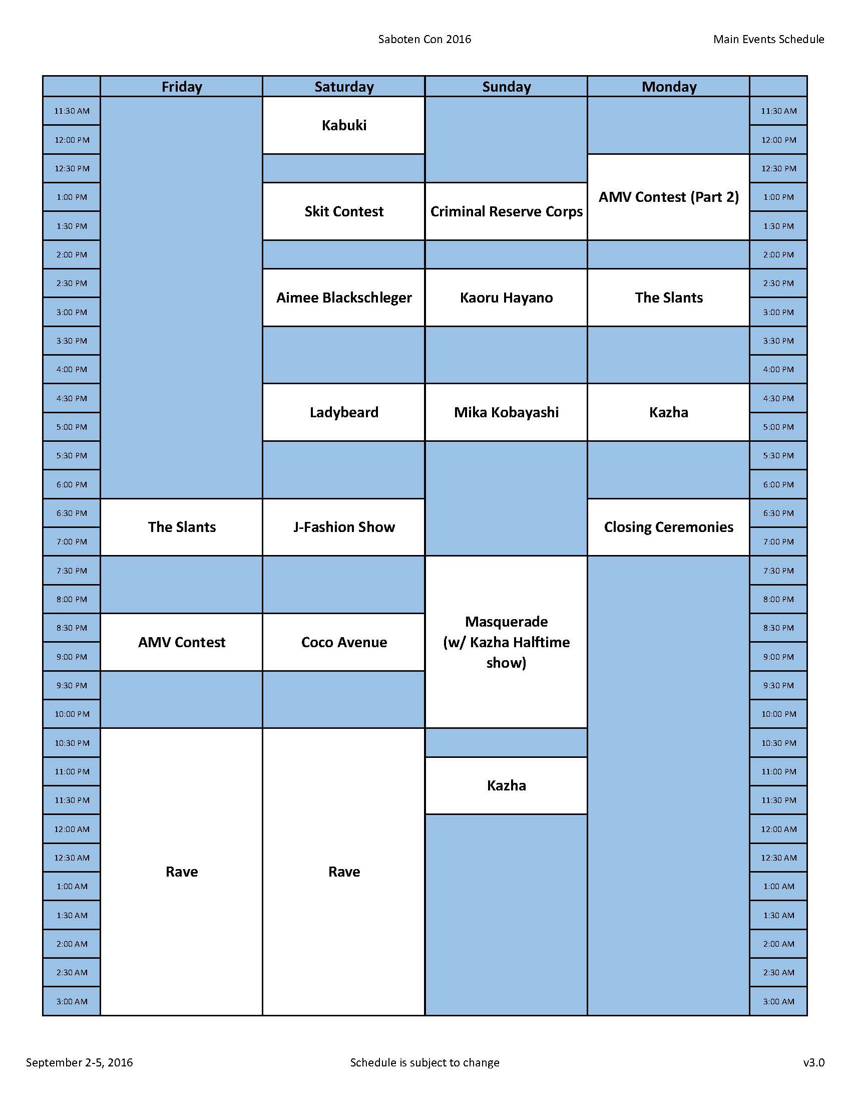 Wondering what time you’re going check out Ladybeard? Wonder no more as Saboten Con released their schedule for main events today. These are concerts and other high priority events, not actual panels, so keep that in mind.