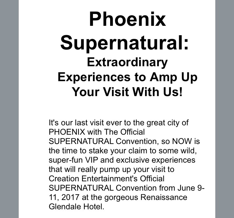 Creation Entertainment, who puts on Supernatural Con, among other fandom conventions, tweeted out a link to an auction meet and greet for Supernatural Phoenix. This link had a very interesting opening, claiming it was “the very last visit to the great city of Phoenix”.