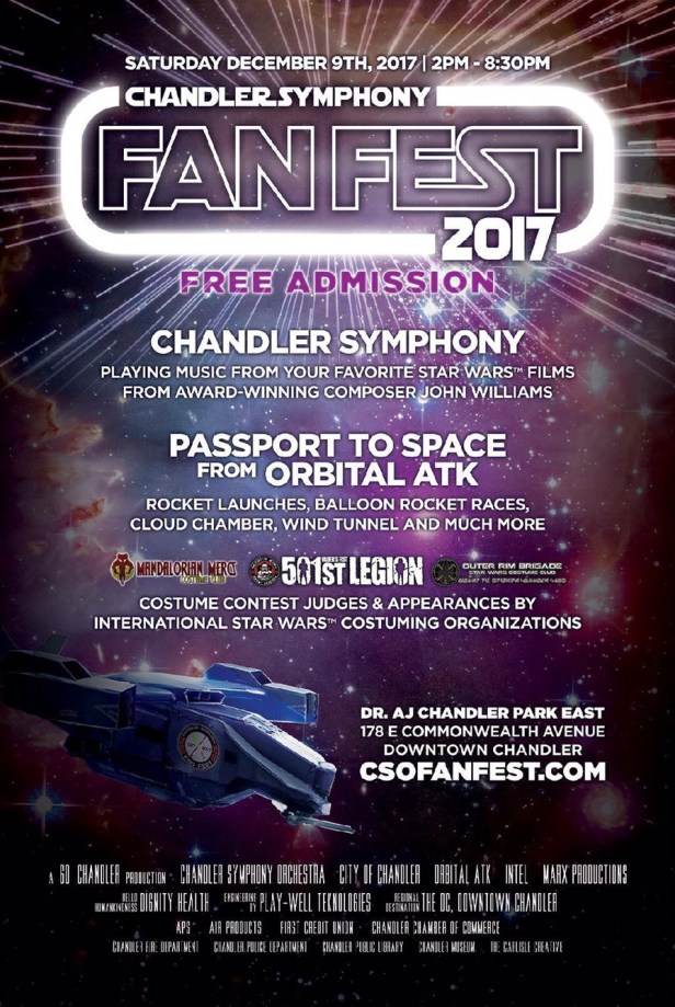 This December in Downtown Chandler, the Chandler Symphony Presents FanFest 2017; a celebration of Star Wars. The FREE event will feature Star Wars themed activities and the music of Star Wars performed by the Chandler Symphony. The event will be held on Decemeber 9th, 2P – 8:30P. Check out the flyer below or CSOFanFest.com for more details!