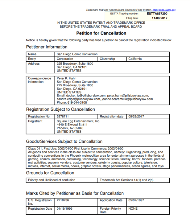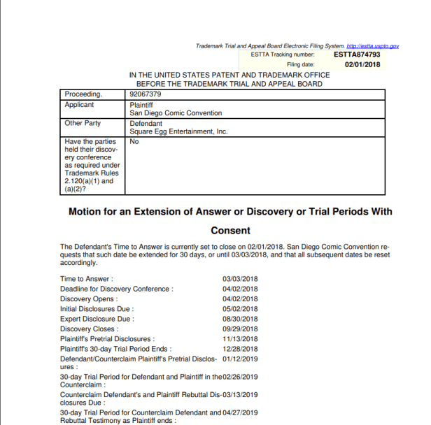 The file San Diego Comic-Con’s claim can be viewed here at the USPTO website. On January 2, 2018, Square Egg Entertainment answered and counterclaimed to have San Diego Comic-Con’s trademark cancelled. As of right now, San Diego Comic-Con motioned to extend the Defendant’s Time to Answer which was granted.
