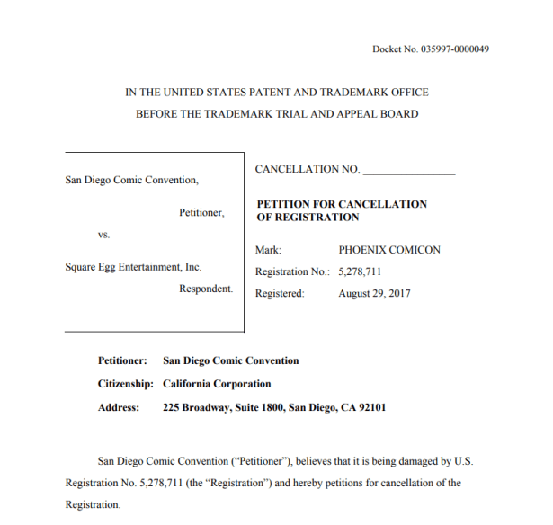 Last month BleedingCool reported that Square Egg Entertainment, the organization that puts on Phoenix Comicon (now Phoenix Comic Fest) filed a trademark cancellation on San Diego Comic-Con’s trademark on the word “Comic Con”. The filing of the trademark cancellation came on the same day that Square Egg changed Phoenix Comicon name to Phoenix Comic Fest. If Square Egg was going to file the cancellation, why would they go through with the name change? I hadn’t seen any news about this story since the initial BleedingCool article, so I did some digging around and came across a few things. San Diego Comic-Con, who also owns the trademarks for Los Angeles Comic-Con, San Francisco Comic-Con, Anaheim Comic-Con, and WonderCon; initially filed to have Phoenix Comicon’s trademark cancelled on November 8, 2017. Weeks before the verdict came out for San Diego Comic-Con’s other court case against Salt Lake Comic Con.