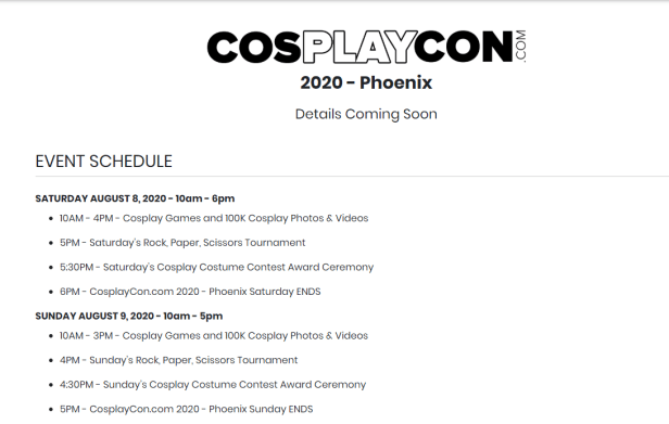 I took a few minutes today to see if I could find any new conventions for the 2020 year and within 60 seconds I stumbled up CosplayCon. This convention has a date of August 8 – 9 at the Phoenix Convention Center which is the same weekend as Game On Expo. While that does seem a little weird, the convention center does have multiple buildings where these two events could be held separately. CosplayCon already has a list of events (as well as the time for each event) that is scheduled to be held at the convention. I’ve reached out for more details on the convention and if I hear back, I will update accordingly.