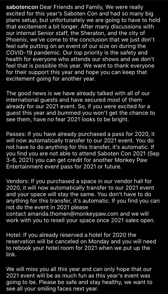 No surprise here but Saboten Con 2020 has been cancelled. The announcement via the Saboten Instagram