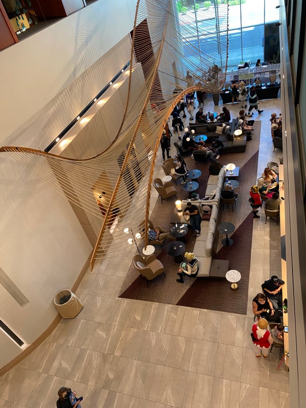 This past weekend, for the first time since 2019, Saboten Con was held. I opted to only go one day for a few different reasons and decided on Sunday. I got there a little after 11AM when the exhibit hall opened and panels kicked off and there was already a decent amount of people in attendance. The first thing I noticed was the remodeled lobby of the Sheraton Phoenix Downtown. The hotel remained closed during the pandemic and used that time to completely give their lobby a new look. The space is very bright, very open, and has very “clean” look to it.