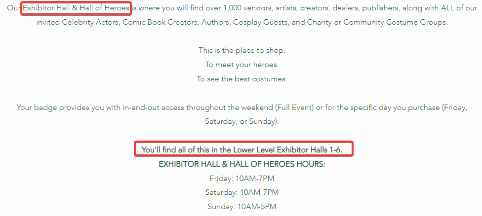As a note, based off this wording, I think the Hall of Heroes will be in the normal lower level exhibitor hall like how it was before it moved to the top floor of the convention center. Based off this, this is why I believe that: