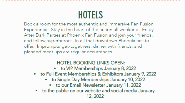I randomly decided to check out the Phoenix Fan Fusion website today and to my surprise, it was given a make over and had a lot of information in regards to the 2022 convention. Before we get to it, I just wanted to remind you that with this information being posted 6 months out, I’m sure everything is subject to change.
