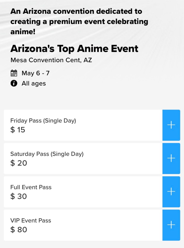 Anime Arizona will take place May 6-7 (yes, that’s a Friday – Saturday) at the Mesa Convention Center. Tickets are currently on sale and break down as follows