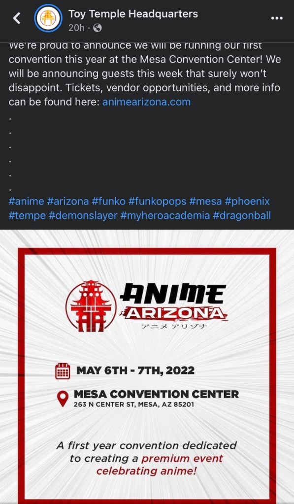 New conventions are always exciting and this definitely falls under that category. Local toy store chain Toy Temple recently announced they are putting on a two day anime convention in Mesa called Anime Arizona.