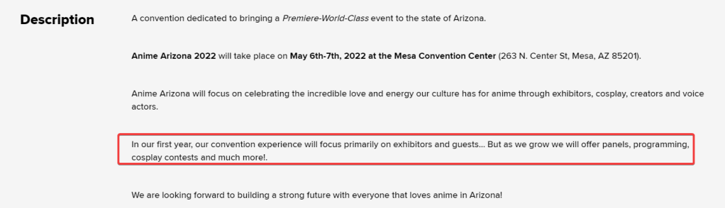 Keep in mind this first year con will be focusing on directly guests and exhibitors. No panels (not even guest panels) and much of anything outside of those two things. This comes directly from the ticket page of Anime Arizona