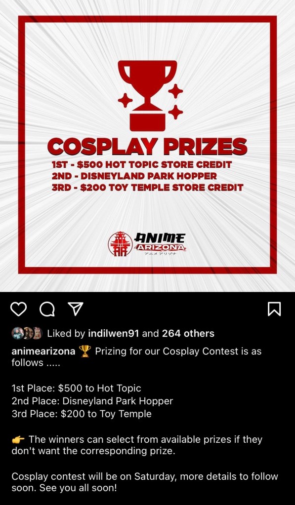 While the blurb mentions cosplay contests as something being offered in the future, the official Instagram account for Anime Arizona did announce a cosplay contest (with some good prizes) but nothing has been posted on their website.