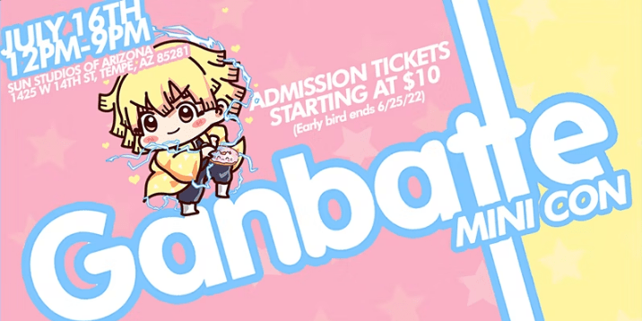 Ganbatte has put on a few pop up events over the past year or so but now they are holding a “Mini Con” and yes, it’s indoors! Being held on Saturday, July 16th at Sun Studios of Arizona in Tempe, you can get your fix of cosplay, anime, cars, kpop and more. Tickets are currently $15 + tax (there is also a VIP option with some perks for $30) and can be purchased via Eventbrite.