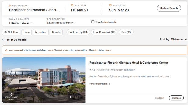 What about staying at the hotel for the con? Well, oddly enough, the Anime Arizona website has zero mention of a room block or any info about staying at the Renaissance. The hotel website paints a clearer picture: its sold out.